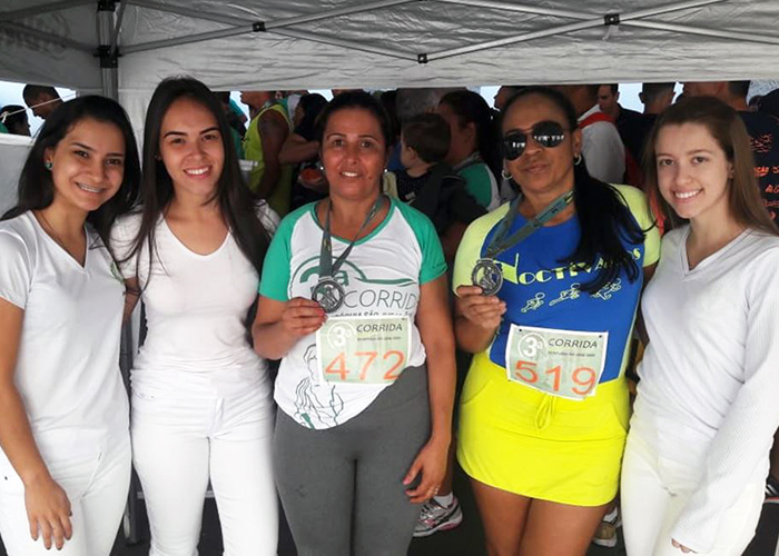 A 3ª edição da Corrida Rústica de São Judas Tadeu, em Divinópolis, contou com a colaboração do curso de Fisioterapia da UNIFENAS. Além de auxiliar os participantes no aquecimento e alongamento, as universitárias do 4º período também aferiram a pressão arterial e transmitiram orientações de saúde. A ação da Universidade foi coordenada pela professora Helenise Aparecida Pereira Rabelo. A professora Cecilia Ferreira de Aquino apoiou a iniciativa. Na foto, alunas de Fisioterapia com duas competidoras da Corrida Rústica.