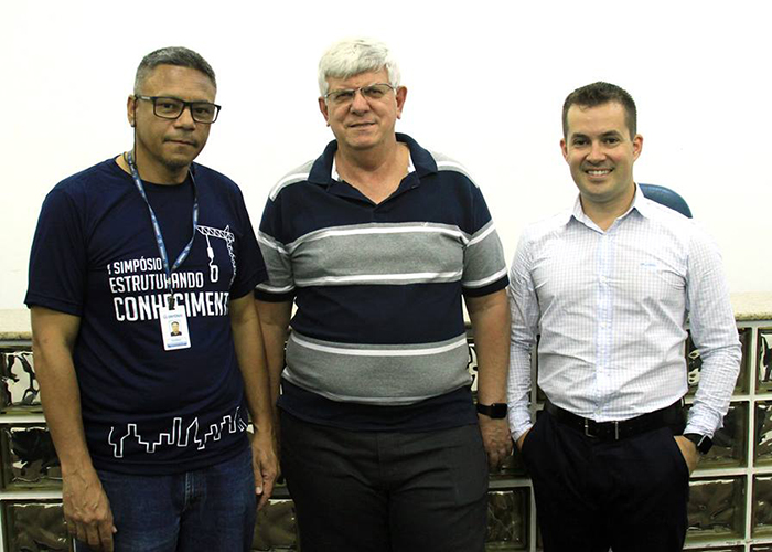 O coordenador do curso, professor Rogério Carlos Mariano, relata que a alvenaria estrutural está sendo muito difundida no mercado atualmente, então “este Simpósio é muito importante para que os estudantes conheçam uma nova tecnologia de construção”. No final de cada palestra, houve sorteio de brindes, como, por exemplo, de um Kit Mola (aparelho que emula os efeitos estruturais de uma construção). Na foto, o professor Rogério Mariano e os palestrantes Luiz Carlos e Rangel Lage.