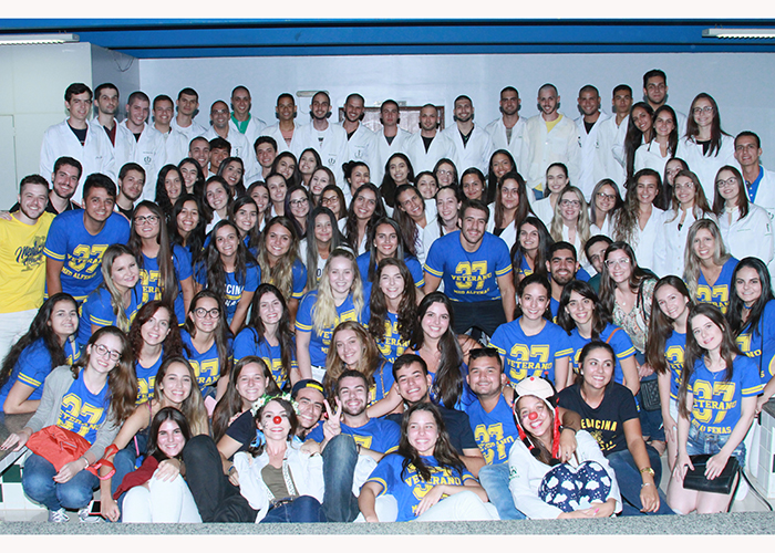De jaleco, os calouros da Medicina com os veteranos da Turma 37 e duas acadêmicas da Liga de Risologia