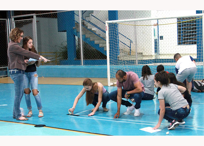 Na quadra de esporte, os alunos simularam um projeto de uma cozinha residencial em tamanho real, utilizando fita crepe