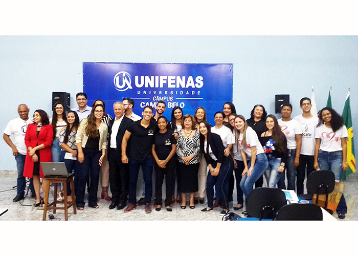 Daniela RodarteDurante o 18º Fórum de Extensão Universitário da UNIFENAS, câmpus de Campo Belo, ocorreram, dia 25 de abril, as apresentações dos projetos de extensão desenvolvidos pelos acadêmicos do curso de Direito. Ao todo foram seis projetos apresentados: Núcleo de Direito Ambiental; Projeto ASCARBE; Parceiros de Sangue; Arte e Cultura na UNIFENAS; Direito do Consumidor na Praça e Promoção Jurídico-Social. Para abrir o encontro, que traz o tema: “Justiça Social”, o Grupo vozes, que faz parte Projeto Arte e Cultura na UNIFENAS, apresentou um número musical interpretando a música “What a wonderful world”, de Louis Armstrong. Na foto, gestores, professores, colaboradores e alunos do câmpus de Campo Belo.