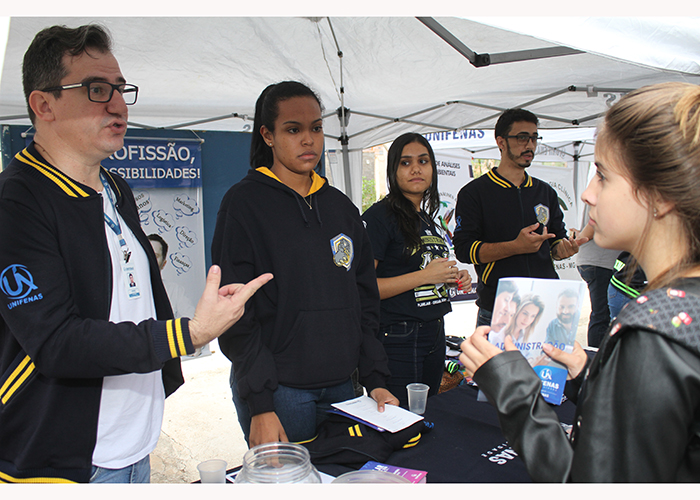 Com cursos nas áreas de Ciências da Saúde, Ciências Agrárias, Ciências Exatas e Ciências Humanas, a UNIFENAS, por meio de seus universitários e professores, possibilitou a estudantes que estão entre o 9º ano do Ensino Fundamental e o 3º ano do Ensino Médio da Escola Estadual Dr. Napoleão Salles, em Alfenas, uma troca de experiência que pode impactar no futuro dos adolescentes. Estes estudantes participaram da Feira das Profissões realizada na escola.