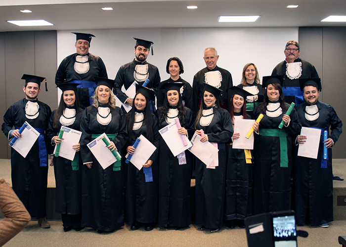 A Sala Professor Edson Antônio Velano, câmpus de Alfenas, recebeu na tarde de 10 de julho, a colação de grau em separado (foto) dos formandos em Agronomia, Biomedicina, Ciências Contábeis, Engenharia Civil, Farmácia, Medicina Veterinária e Psicologia. Amigos e familiares acompanharam a cerimônia, que foi presidida pelo professor Rogério Ramos do Prado, diretor de extensão e assuntos comunitários. Estiveram presentes ao evento os coordenadores Paulo Roberto Corrêa Landgraf (Agronomia), Regiane Tercetti Rodrigues (Biomedicina) e Rosane Carvalho da Silveira Abbade (Psicologia).