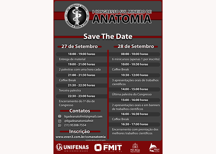 A Liciem (Liga de Ciências Morfológicas), do curso de Medicina da UNIFENAS, câmpus de Alfenas, apoia a organização do “1º Congresso Mineiro de Anatomia”, que será realizado, nos dias 27 e 28 de setembro, em Itajubá. O evento será promovido pela Liga Acadêmica de Anatomia da Faculdade de Medicina de Itajubá, com o apoio da PUC de Poços de Caudas, da Fundação de Ensino e Pesquisa de Itajubá e da UNIFENAS. De acordo com os organizadores, o Congresso pretende “integrar diferentes áreas da saúde que utilizam a disciplina de Anatomia como essência”. A programação conta com palestras, minicursos e apresentação de trabalhos científicos. As inscrições podem ser realizadas pelo site https://www.even3.com.br/csmanatomia/.