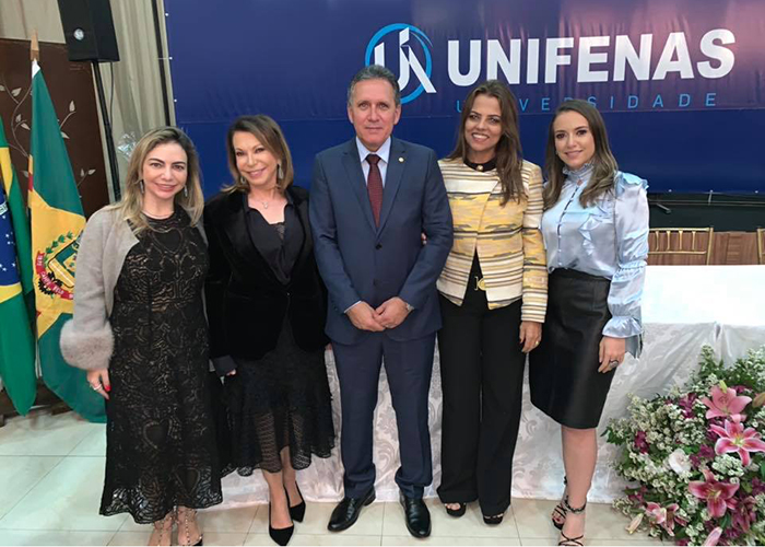 A Dra. Larissa Araújo Velano, pró-reitora administrativo-financeira; com a Profa. Maria do Rosário Araújo Velano, reitora da UNIFENAS; o desembargador Dr. José Afrânio Vilela e a sua esposa Gisela Pereira Resende Vilela; e a Dra. Viviane Araújo Velano Cassis, vice-reitora da UNIFENAS