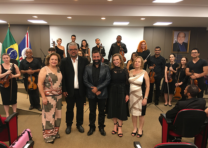 Profa. Sônia, os maestros Alessander Sebastião e Thiago Moraes com a reitora profa. Maria do Rosário, a profa. Sandra Remondi e a orquestra de cordas ao fundo