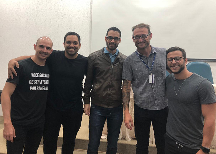 Na Sala de Eventos I, onde ocorreu o workshop, o egresso César, palestrante Marcel, coordenadores Bruno e Cesar Augusto e o palestrante Matheus